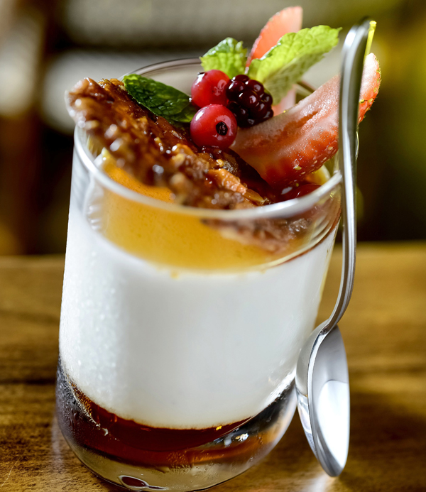 Em uma taça, 2/3 de panna cotta e 1/3 de caramelo- delicadamente para não misturar os dois ingredientes- e levar para geladeira por 8h