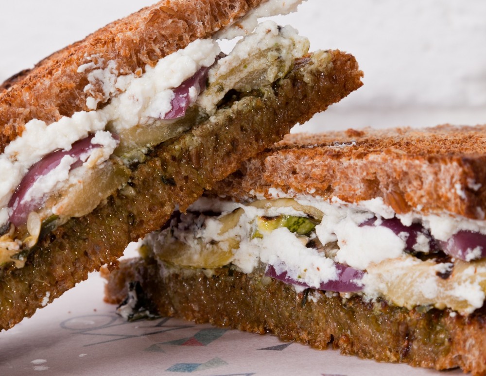 Sanduíche de abobrinha marinada com queijo de cabra e pesto